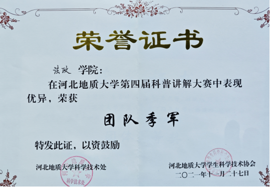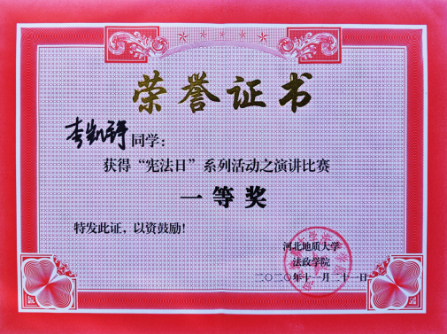 科普讲解大赛团队季军、“宪法日”演讲比赛一等奖。