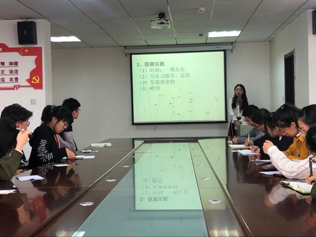 团支书经验交流会议。此次会议由16级团支书张旭、熊宁馨、赵雅婷为17级、18级团支书分享团支书工作经验。