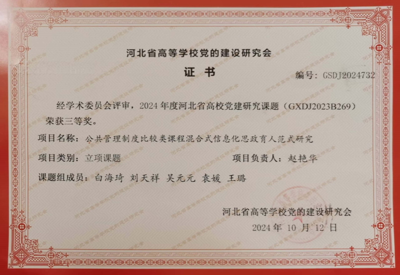 的“公共管理制度比较类课程混合式信息化思政育人范式研究”(GXDJ2023B269)课题获评三等奖。
