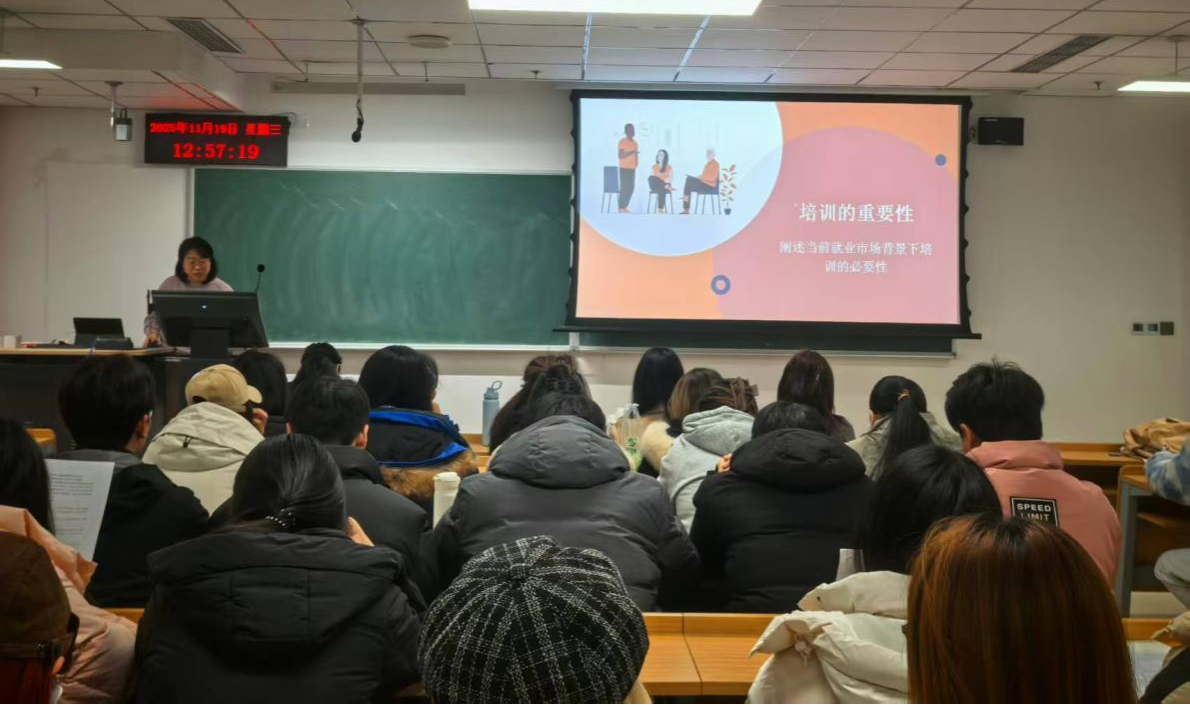 王璐为实训项目负责人,详细介绍了本次实训的核心内容。项目围绕“招聘全流程与企业真实软件实战”、“职业技能双提升—既会招聘,更懂求职”、“数字化HR与培训发展”三大模块展开,通过案例研讨、模拟实训、企业导师带教等方式,助力学生夯实专业能力、积累实战经验、提升就业竞争力。现场交流踊跃,学生报名积极。
