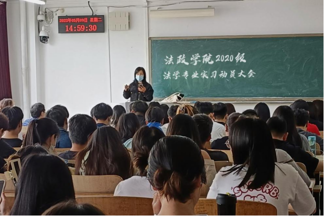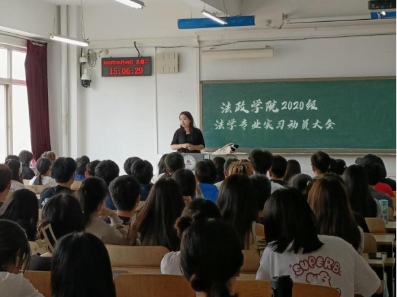 党委副院长秦玉娈、党委副书记朱晓玲、辅导员杨柳、各实习地点带队老师,全体2020级法学专业本科生参会。