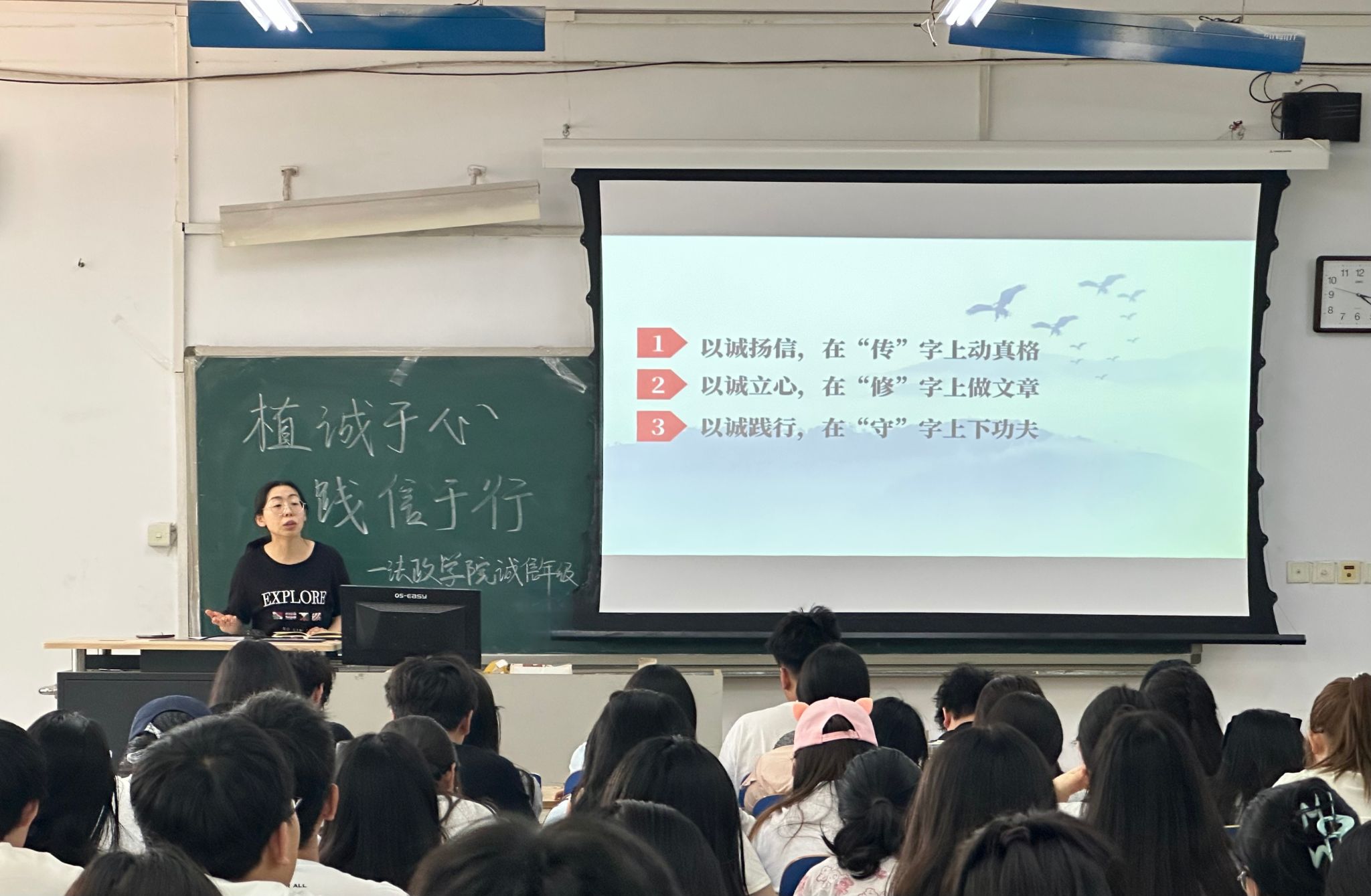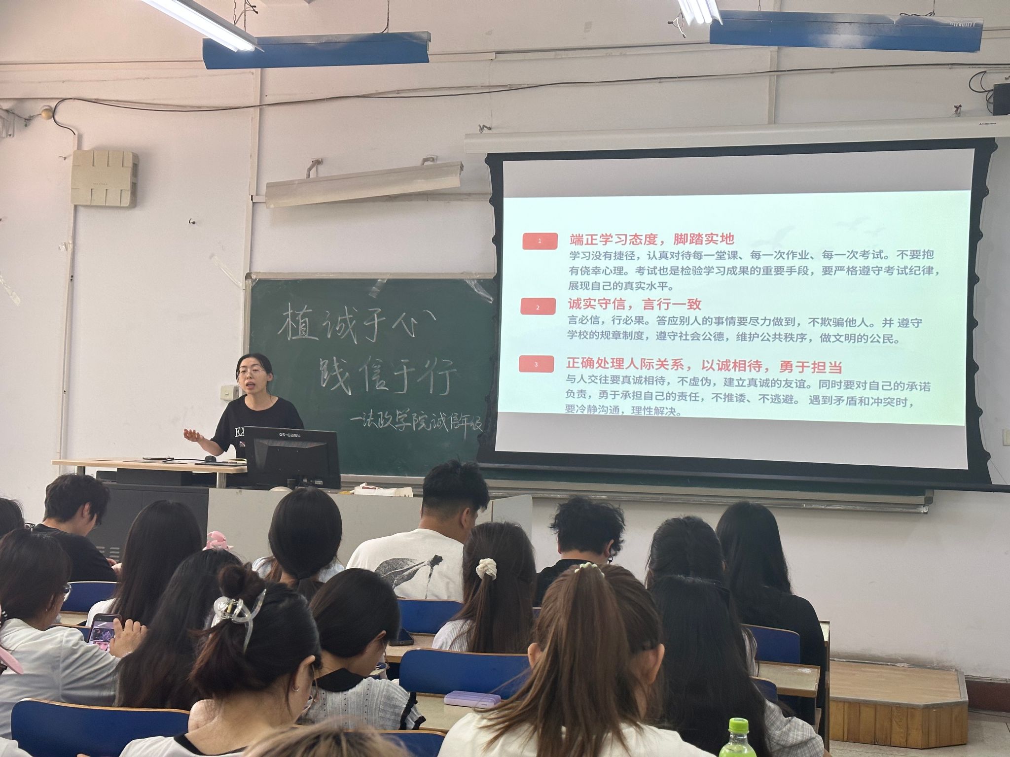 2023级于5月27日在辅导员张璇老师的主持下,成功举办以“植诚于心,践信于行”为主题的诚信教育年级会。旨在通过深入浅出的讲解和生活鲜动的视频案例学习,引导学生深刻理解诚信的内涵,将诚信理念内化于心、外化于行。