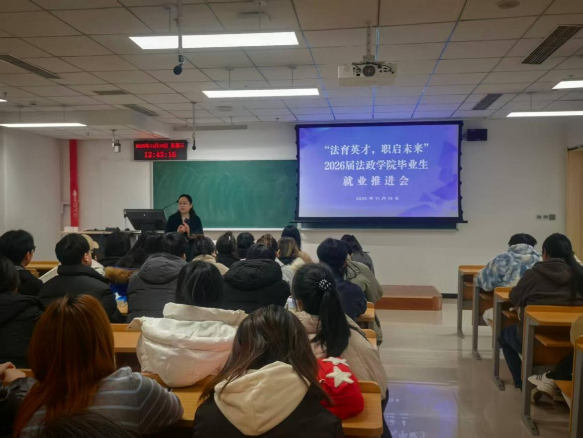 组织召开“法育英才,职启未来”2026届毕业生就业推进会。学院党委书记董莉,副书记朱晓玲,教工第二党支部书记、行政管理教研室教师王璐,支部委员、劳动与社会保障教研室教师赵艳华,毕业班辅导员石金利以及行政管理与劳动与社会保障专业毕业班同学共同参加。